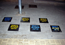 Plaques de guanyadors grocs o blaus de la Festa Major de cada any.