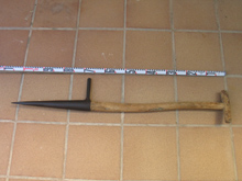 Observacions: Aquesta eina era emprada per fer forats en un terra prèviament preparat i poder-hi plantar ceps. Si hom no tenia prou força, s’ajudava fent pressió amb el peu sobre el sortint de la part del ferro.