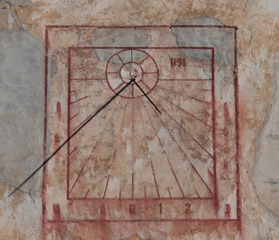 Dimensions: 1,40 x 1,40 m. aprox. Duu una cara de sol amb aureola i rajos, pintada i la data 1798.