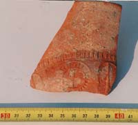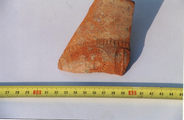 Descripció : Fragment de ceràmica sigil·lada gàl·lica, de forma trapezial, d'uns 7 cm de base major, 4 cm de base menor, 8 cm d'altura i uns 4 mm de gruix